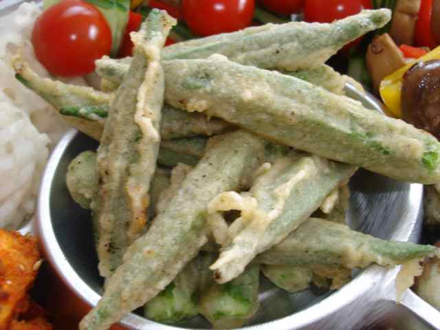 オクラのスパイシー揚げです。クミンと醤油の味つけ衣になっています◎