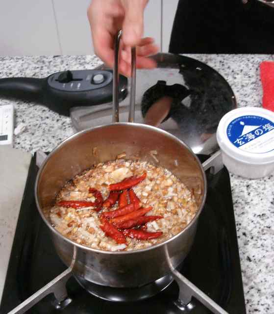 まずは、恒例 玄米の炊き方をおさらい〜 後、八丁味噌を使っての甜麺醤と、辣油作り ◎