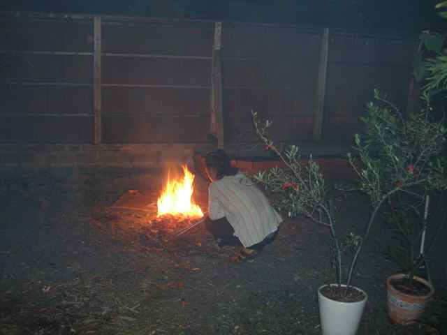 で、帰宅後 なぜか野菜の種まきに取り組むダンナ君と「焚き火だ〜!!!」 ????